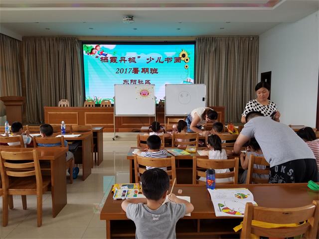 “老师,我的太阳画好了!”“老师,树叶我不会,你教我好吗?”“我要给它涂一个我喜欢的颜色。”在东阳社区“栖霞丹枫”暑期少儿书画班的课堂上,时不时传来孩子们稚嫩的声音,他们或专心听讲,或认真思考,或用心画画。