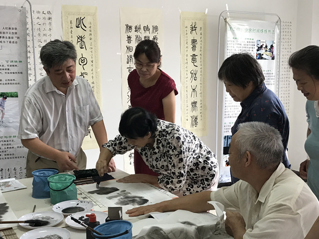 “用大提斗笔泼墨,大胆落笔,横涂竖抹,画出有虚实变化的前叶,再调淡墨画后面的荷叶,注意外形的变化!”吉卫明老师讲述着《荷塘清趣》画的要领和步骤,课堂上老年学员细心的聆听着。三个小时的上课,吉老师深入简出的介绍了书画的基本知识,并现场为老年学员们讲解了画荷叶的基本要领和技巧。