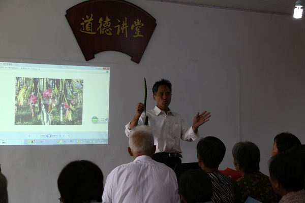 毕教授告诉村民们影响无公害蔬菜产品安全质量的主要因素有:有害的金属、非金属物污染、硝酸盐和亚硝酸盐污染、农药残留污染。教大家如何利用鸡粪之类的动物肥料,不是所有动物肥料都可以立即使用的,需要让它发酵以后才可以使用。毕教授还教了大家农药的分类以及什么样的农作物需要什么样的农药和什么时间打农药以及打农药的方法,尤其提到乐果不能用在治疗生虫的蔬菜上,这个药水对人体健康危害比较严重,只能用在花草树木上。毕教授还回答了村民的一些种植疑惑,比如说:“为什么辣椒要种密集一点产量才高?因为辣椒如果种的太稀疏不利于辣椒杆子保存水分”等等。毕教授还为村民们带来了火龙果的种子和种植方法,有兴趣的村民会后都留存了教授的手机号码,便于以后不懂的好自己和教授沟通。最后,毕教授还教大家如何制作葡萄酒,非常简单的制作方法和工具,通俗易懂的语言常常赢得大家的连连不断的掌声。