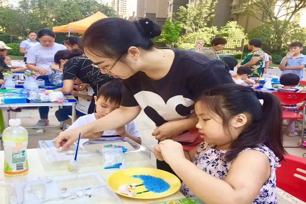 活动有糖画、圆盘画、纽扣花束、露天电影四种类型,分为两个环节,第一环节是手工活动,包括糖画、圆盘画、纽扣花束三种,居民现场参加,自由构思,亲手制作,展现自己的设计灵感。活动刚开始就吸引了大批居民报名参与,特别是小朋友花样作品,展现了一颗颗天真且具有创意的纯美心灵;第二环节是观看露天电影《疯狂动物城》,这是专门为小朋友打造的一款与动物的盛会。吃过晚饭后,小朋友们跟家长陆续来到广场,围坐在银幕旁期待着,电影准时开播,小宝贝们个个目不转睛,十分投入,秩序井然。
