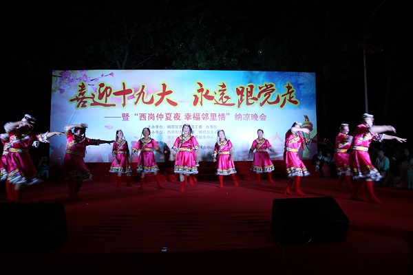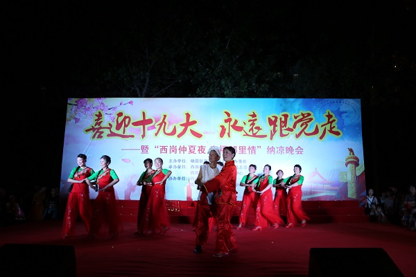为了迎接党的十九大召开,歌颂党的丰功伟绩和祖国的繁荣富强,为了丰富居民的文化娱乐生活,开拓社会组织党建新模式,展现西岗街道居民幸福生活和安居乐业的新面貌,9月16日晚,由栖霞区西岗街道工委、办事处主办,西岗街道社区教育中心、西岗街道社会组织服务中心承办,西岗街道星缘荟和南京爱德社会工作服务中心协办的“喜迎十九大,永远跟党走-暨‘西岗仲夏夜,幸福邻里情’纳凉晚会”在摄山星城中心广场举行。