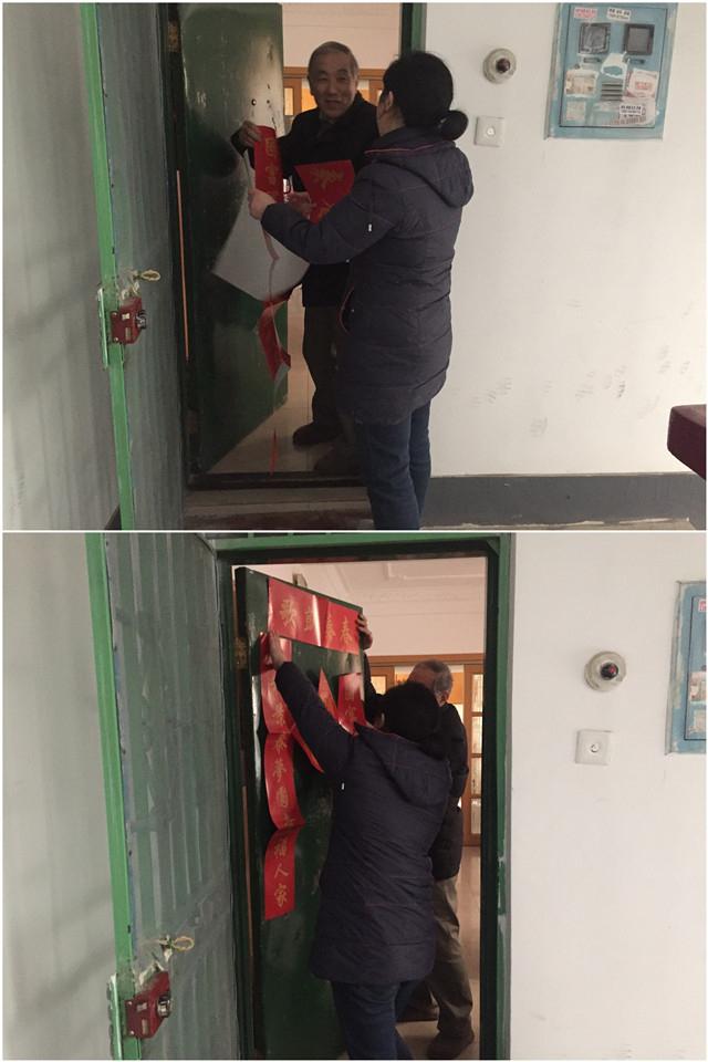 首先来到了贾兆琦同志的家中,他是社区党支部小组组长,更是社区内的一位“名人”。他喜爱参与文体活动,更热心于社区内的各项公益事业。在社区的歌唱团体组织中担当组长一职,免费教居民唱歌技巧,给大家带来欢乐。当看到社区工作人员来家中送春联时,他十分热情地跟大家讲解起了春联的相关知识。他说:“春联又叫“春贴”、“门对”、“对联”,讲究上下联字数要相等;上下联词组要相同,词性要一致;上下联对应语句的语法结构应尽可能相同;上下联平仄要相调等”,还就赠送的这幅春联举了实例,让大家收获颇丰。