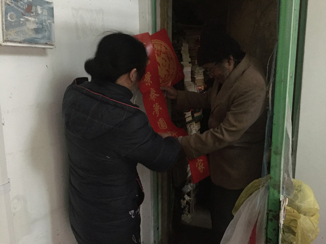 接下来工作人员来到了牛天扬同志的家中。敲了很久的门,只听见屋内英语广播的声音,却迟迟无人开门。于是我们拨通了他的电话,原来他在屋内学习英语太过入神,没有听见。他是栖化新村社区内学识最为渊博的老人之一,虽然只有初中学历,但通过自学熟悉掌握了英语交流的能力。在他的家中我们可以看到书堆的比人高,几乎没有可以立足的地方。然而过着独居生活的他,没有妻子儿女的照顾,总是一人逛书店。临近春节,社区工作人员上门为他送去了春联和祝福让他倍感温暖,他亲切地对着我们说“谢谢,希望你们新年愉快。”