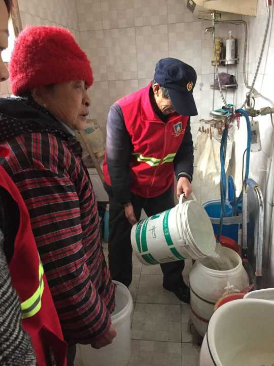 南水社区得知王玉来家停水消息之后,在第一时间联系了自来水站,并了解到:附近主次水管因冰冻天气导致多处水管漏水,正在组织抢修,可能会需要较长时间。考虑到王玉来夫妇年龄都接近80岁,子女又不在身边,停水之后务必给他们得生活造成很大的困难,社区当即组织了志愿者从附近挑送了4桶生活用水给老人送去,之后,又帮助老人家里做了一个年前大扫除。