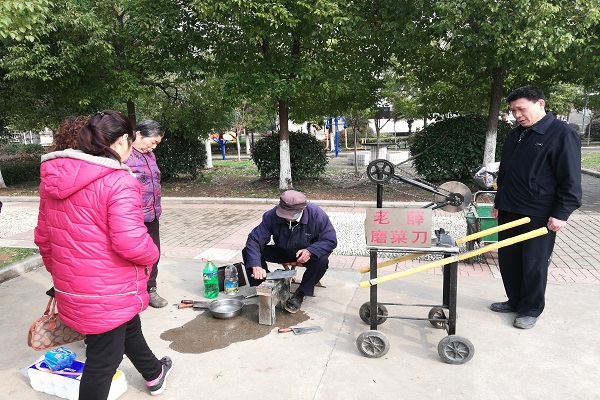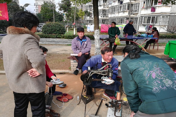 一大早,社区广场就开始热闹起来,看到有免费服务,许多老人赶紧又跑回家,不一会儿拿来了坏掉的鞋子和钝掉的菜刀,在技工师傅旁边静静地等候起来。许多老年人都有着节俭的习惯,对于坏掉一点的东西都舍不得扔,所以维修对于他们来说是非常开心的事情。春天到了,天气转暖,老人们留了一个冬天的头发终于也在春风和煦中剪落到地,剪短了的发型看起来更年期,更精神。