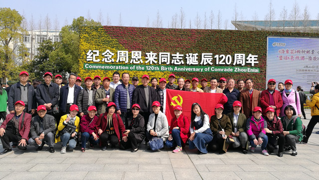 首先,大家来到了位于淮安市城北桃花垠的周恩来纪念馆。该馆于1992年1月16日建成,馆区由纪念岛、宽阔的水面和湖四周环形绿地组成,总面积达三十五万平方米,其中百分之七十为水面。导游带领着大家从纪念馆南北800米长的中轴线上依次参观,经过瞻仰台、纪念馆主馆、附馆、周恩来铜像和仿北京中南海西花厅等纪念性建筑;还参观了岚山诗碑、海棠林、樱花路、五龙亭、怀恩亭等景点。党员们一边感叹景点的壮观与肃穆,一边抒发着对周总理的深深怀念。