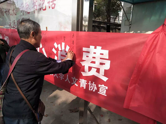 在场居民听得非常认真,不时提出自己的疑问或者生活中遇到的各种法律问题。活动的最后,志愿者和社区居民一起在安心消费的横幅上签字。