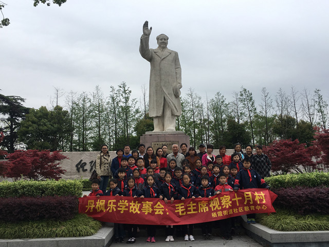4月13日上午还是风雨交加,临近中午,风雨渐歇,天气突然转好,真乃天公作美!天随人愿!栖霞街道社区教育中心"丹枫乐学"故事会——毛主席视察十月村系列活动如期于当天下午两点准时举行。参加此次活动的有学生、家长代表、社区教育中心的教师,一行六十多人。栖霞区社区教育学院的杨洁主任和佘云老师全程参与。