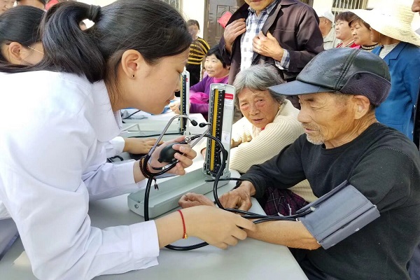 活动现场,村民们主动有序地排起队伍,一旁的志愿者们一一为村民测量血压,测量完血压后,志愿者告诉村民们测量结果并为其提供简单的咨询和建议。