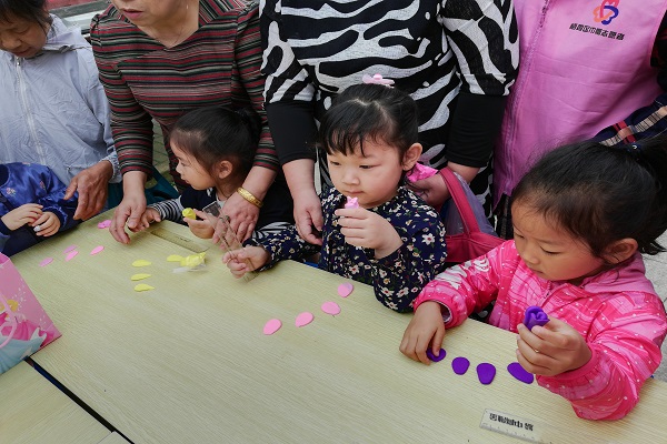 一早,工作人员把横幅、桌椅和手工材料准备到位,现场招募参加活动的小朋友,不一会儿桌子边就围满了可爱的宝宝们,身旁还有他们强大的后盾:家长!手工老师特别有教小宝宝的经验,分解了制作方法一步一步地细心教学:首先制作第一片花瓣,然后第二片……再制作叶子,最后一朵朵五彩美丽的玫瑰花就在宝贝和家长的配合下终于成型啦!虽然宝贝们制作的玫瑰花没有老师做的那么完美,有点歪歪扭扭,但许多孩子都是第一次制作粘土玫瑰花,歪歪扭扭的样子更加凸显了小朋友们的天真、可爱。