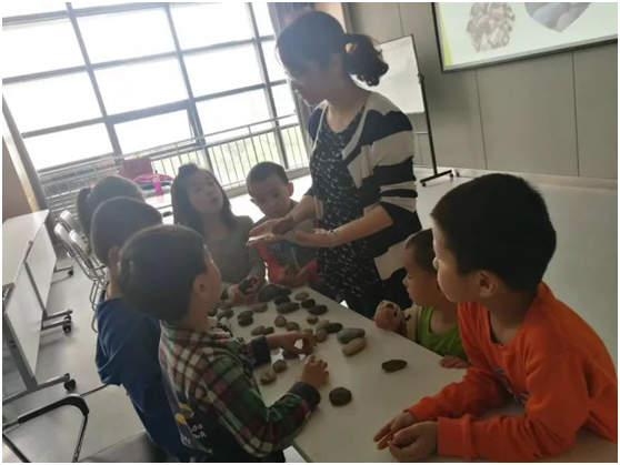 随后环节,孩子们通过观察从形状、大小、颜色、表面、斑纹等方面描述了自己的那块石头,让其他小朋友猜,孩子们积极参与,大胆猜测,现场气氛活跃。该环节旨在锻炼孩子们的观察和表达能力。
