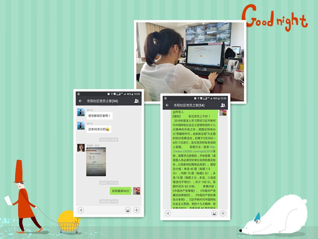 2018年是深入学习贯彻习近平新时代中国特色社会主义思想和党的十九大精神的开局之年,东阳社区以深入学习贯彻党的十九大精神为契机来抓好党员“两学一做”学习教育和党风廉政教育,积极组织社区45岁以下党员参加栖霞区“把握新时代,启航新征程”党史知识竞赛网上答题活动。为了保证此次知识竞赛活动参与率和学习效果,东阳社区通过线上线下相结合的方式确保通知宣传到位、操作讲解到位、考点学习到位,同时为党员们列出了《中国共产党章程》、《中国共产党廉洁自律准则》、《中国共产党纪律处分条例》等相关学习内容书目。最终,东阳社区39名党员和3名入党积极分子完成了学习和知识竞赛,最高得分为96分。