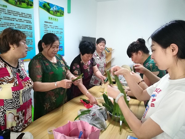 不一会儿桌上一个一个粽子就堆成了小山,大家学习着“高手”的独特技能,互相讨论交谈着,将一片片粽叶叠加铺排扭转折叠,小巧精致的粽子便跃于指尖。不仅有粽子,社区还准备了咸鸭蛋、绿豆糕,和粽子放在一起变成端午“大礼包”送给每个退休家庭,大家的脸上洋溢着快乐的笑容,小屋里充斥着满满的温情。