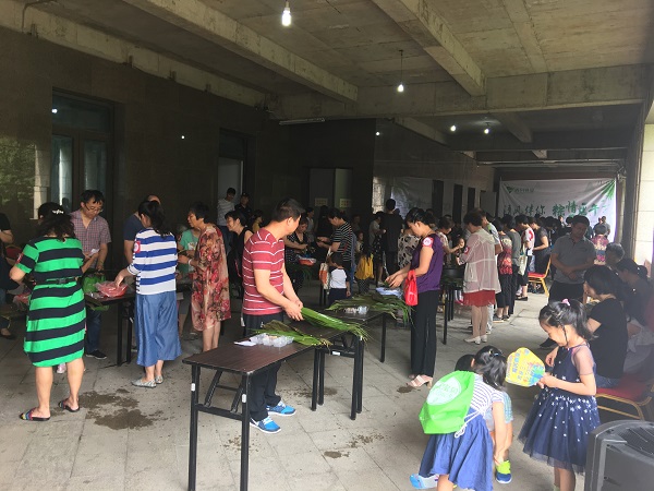 现场还举行了包粽子比赛,10人分为一组,大家欢聚一堂包粽子。活动中,大家手中粽叶舞动,麻绳穿梭,一个个可爱、鲜绿的粽子就这么诞生了。许多年轻的居民是第一次包粽子,热心的阿姨就一对一、手把手地教他们如何包各式粽子,活动现场喜气洋洋、其乐融融。