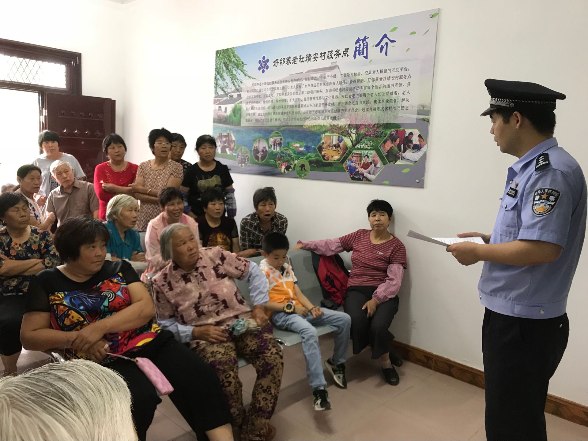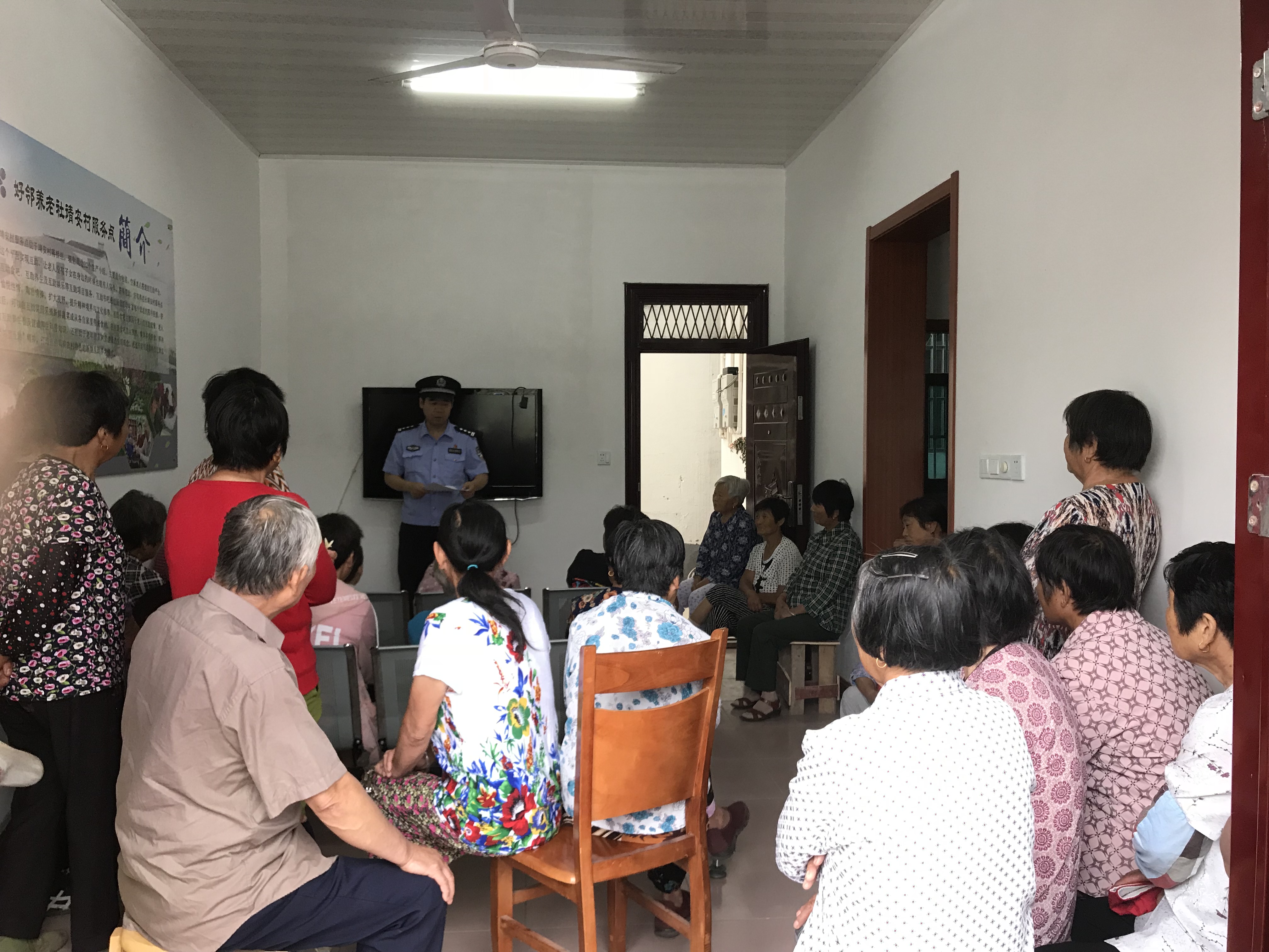 2018年6月22日上午,靖安村居民学校联合靖安派出所在靖安村好邻养老社开展老年人防诈骗知识讲座。