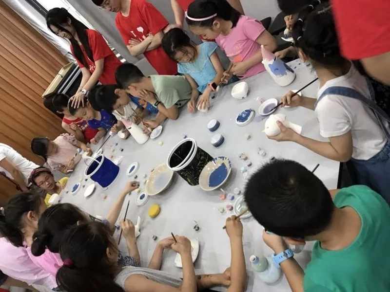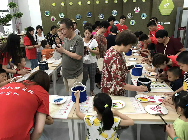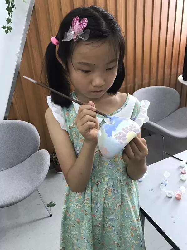 下午2点整,仙林党群服务中心308室社创中心迎来40余名幼儿和小学生,按照各自喜好,分成两组,一组绘制扇面,另一组绘制陶制品,孩子们拿起毛笔在大哥哥大姐姐们的指导和协助下开心的在扇面上挥洒着童趣色彩。有的画幅荷花、有的画幅青山绿水,有的画幅朝霞,坐在一旁闲聊的家长看到孩子们的作品,欣喜的连连夸赞。另一组绘制陶制品的孩子们一支手托起陶制品,另一支手拿着毛笔,精心刻画着每一处细节,一支支可爱的小鸟、一棵棵小松树、七彩斑斓的小盘子,凝聚着孩子们细致而又专注的小工匠精神。