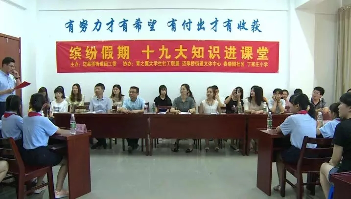 7月12日上午9点,迈皋桥街道团工委携手丁家庄小学,在迈皋桥街道社区教育中心开展了“十九大知识进课堂”缤纷暑假系列活动,来自迈皋桥街道“青之翼”大学生社工联盟的大学生社工和丁家庄小学的师生共同参与了此次活动。