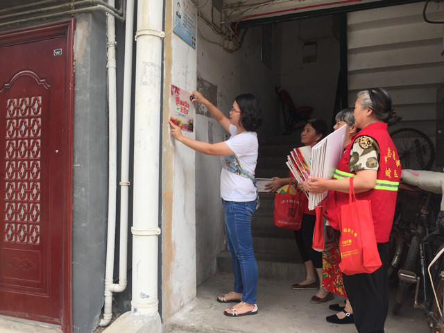 首先,栖化新村社区工作人员将当天值班的退休志愿者邀请到社区,分成三个小组,并且解释了粘贴的原则。之后,工作人员带领大家到社区的楼道之间进行实际粘贴示范,并两两分组,开始了粘贴行动。