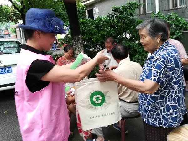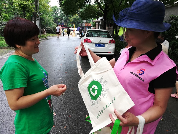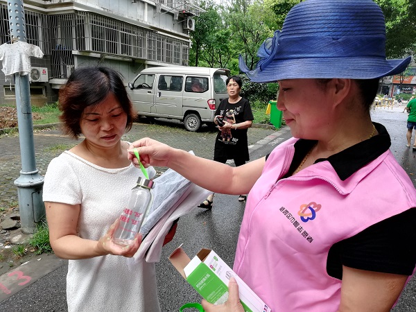 一场突如其来的细雨打破了夏日的沉寂,被热浪阻挡在家里的居民们这时候也出来透透气了。为进一步强化社区居民的环保意识,闻兰社区工作人员带着环保购物袋和环保宣传玻璃杯来到了小区居民集中地,准备用“送礼物”来给居民上一小节环保教育课。