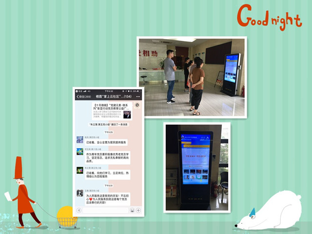 自8月1日起,专人负责,每天在红枫新村小区大门口的显示屏和办事大厅的显示屏上滚动播出,定期在栖霞“掌上云社区”党员群里推送。首批5条公益广告由省委组织部统一包装,每条60秒或90秒,党员看过公益广告后,纷纷发表为人民服务到底的“宣言”。