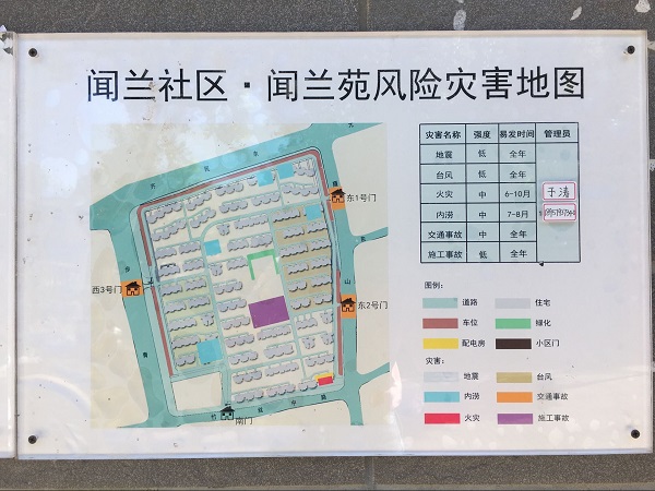 风险灾害地图显示了易发生火灾、水涝、交通事故等风险的位置,这有助于居民在平时的生活中注意防范;应急避难场所示意图是用于指引逃生的图示,上面标有安全场所位置和紧急联系人电话。通过两个小区4张图示的上墙展示,便于居民过往时了解小区安全情况,有针对性地动员每个公民关注身边的各类灾害风险,提高防灾意识,积极参与防灾减灾和应急管理工作,提高自救、互救技能。