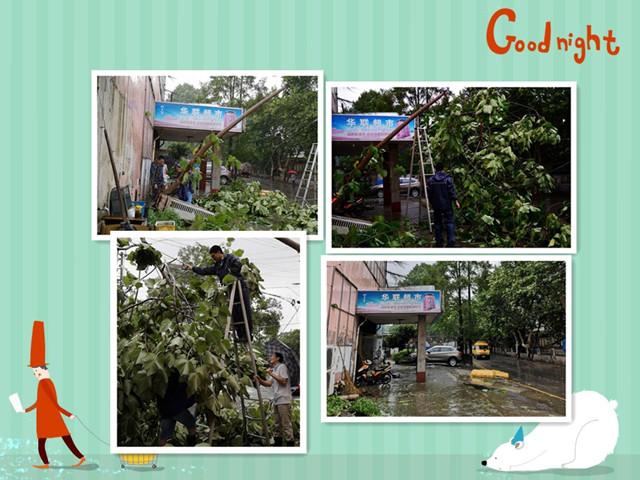随后,银矿地质社区主任吕萍将现场的情况及时向辖区内的南京银茂相关部门进行汇报和协调,由南京银茂派电工到现场解决漏电问题,社区安排人员对被台风刮倒的险树及时进行锯除,风大雨大,现场干活的人员浑身都淋湿了,但是他们并不在意,齐心协力一鼓作气,于14时50分将险树处理结束,在短短的三十分钟内消除了严重的安全隐患,给社区居民出行提供方便。