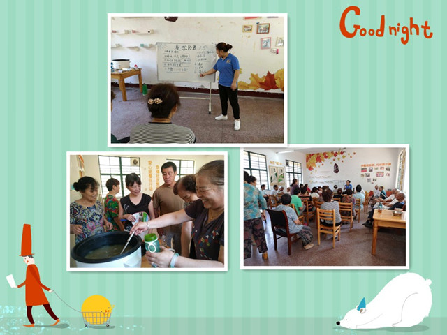 本次主要为老人介绍了夏天会给机体带来什么样的危害,如何防晒等知识。说到夏季降温防暑的食物时候,老人们瞬间像炸开锅一般开始激烈的讨论着,有的奶奶说丝瓜、冬瓜、黄瓜都是夏季可以防暑降温的瓜类,做汤凉拌都可以,有的爷爷说菊花茶、绿豆汤、冰镇西瓜都是天天不离口的。治疗师对他们的提出的防暑食物做了肯定,还给他们推荐了淡盐水,体内的流汗会导致的机体缺水,淡盐水可以很好的为机体补充可以吸收的水分。