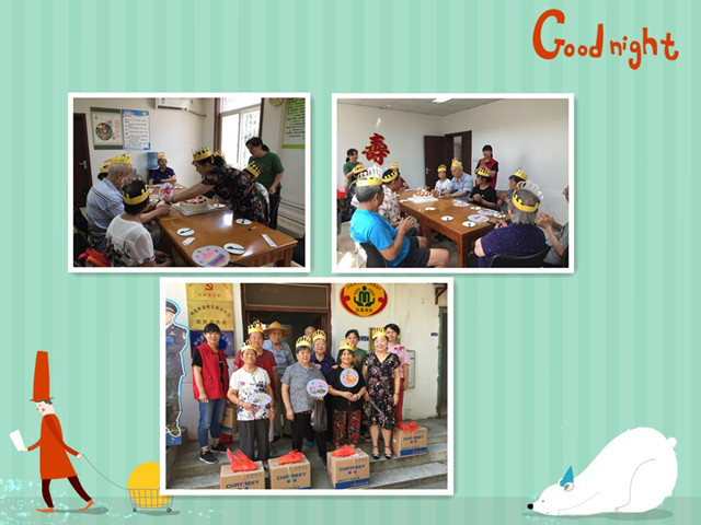 之后,老人们戴上生日帽、共唱生日快乐歌,其中一位寿星还为大家切分了蛋糕。大家相互说笑,一个劲儿地为社区点赞。