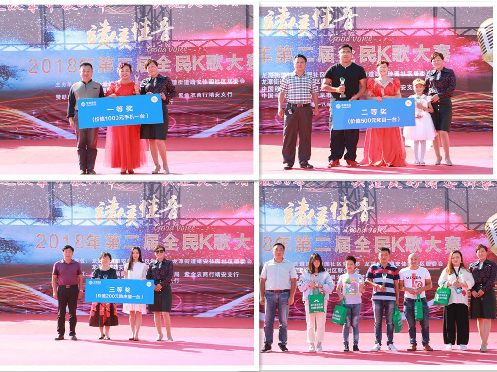 10月6日下午,“喜迎改革开放40年,共建美好靖安新家园”2018年第二季靖候佳音全民K歌大赛总决赛在社区广场成功举行,经过紧张激烈的比拼圆满落下帷幕。出席此次活动的有龙潭街道人大工委陶学勤副主任、文化站陈兵站长、龙潭街道社区教育中心王明鹏主任、靖安佳园社区以及赞助单位相关负责人,龙潭街道飞龙艺术团团长牟学宽等三位老师担任本次总决赛的评委老师。