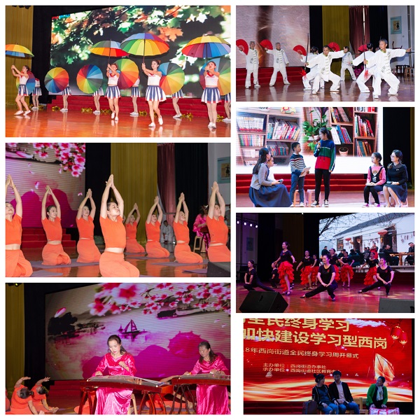 西岗街道从社区建设的实际出发,推动全民终身学习,加快建设学习型西岗,大力推动全民终身学习周活动。首先由西岗街道办事处副主任卞小兵致辞,期待通过全民终身学习活动周的持续开展,终身教育、终身学习的理念与方法能够深入人心,让更多的居民群众参与到学习中来,收获学习成果,体验学习与快乐。舞蹈《光阴的故事》拉开了序幕。活动中还对“优秀志愿者”、“学习之星”、“社区教育优秀工作者”进行了表彰,“墨香西岗”师生挥毫泼墨、展示风采;齐民路社区被评为“全国学习型社区”作为先进集体发言、刘婷代表“优秀志愿者”上台发言、杨娅代表“社区教育优秀工作者”上台发言;社区教育中心瑜伽班的学员为大家带来《舞韵瑜伽》表演,伴奏来自老年大学古筝班学员;西岗街道老年大学带来的表演《太极串烧》,让我们在一招一式中感受以柔克刚的力量;摄山星城小学家长及学生带来的《给你幸福》亲子朗读;齐民路社区工作人员给大家用南京话表演的小品《扶不起》,在当今社区讨论“扶”与“不扶”中看看他们是怎么做的;听竹社区竹之韵舞蹈队给大家展示《魅力西岗》。载歌载舞,展现了西岗街道社区教育成果。