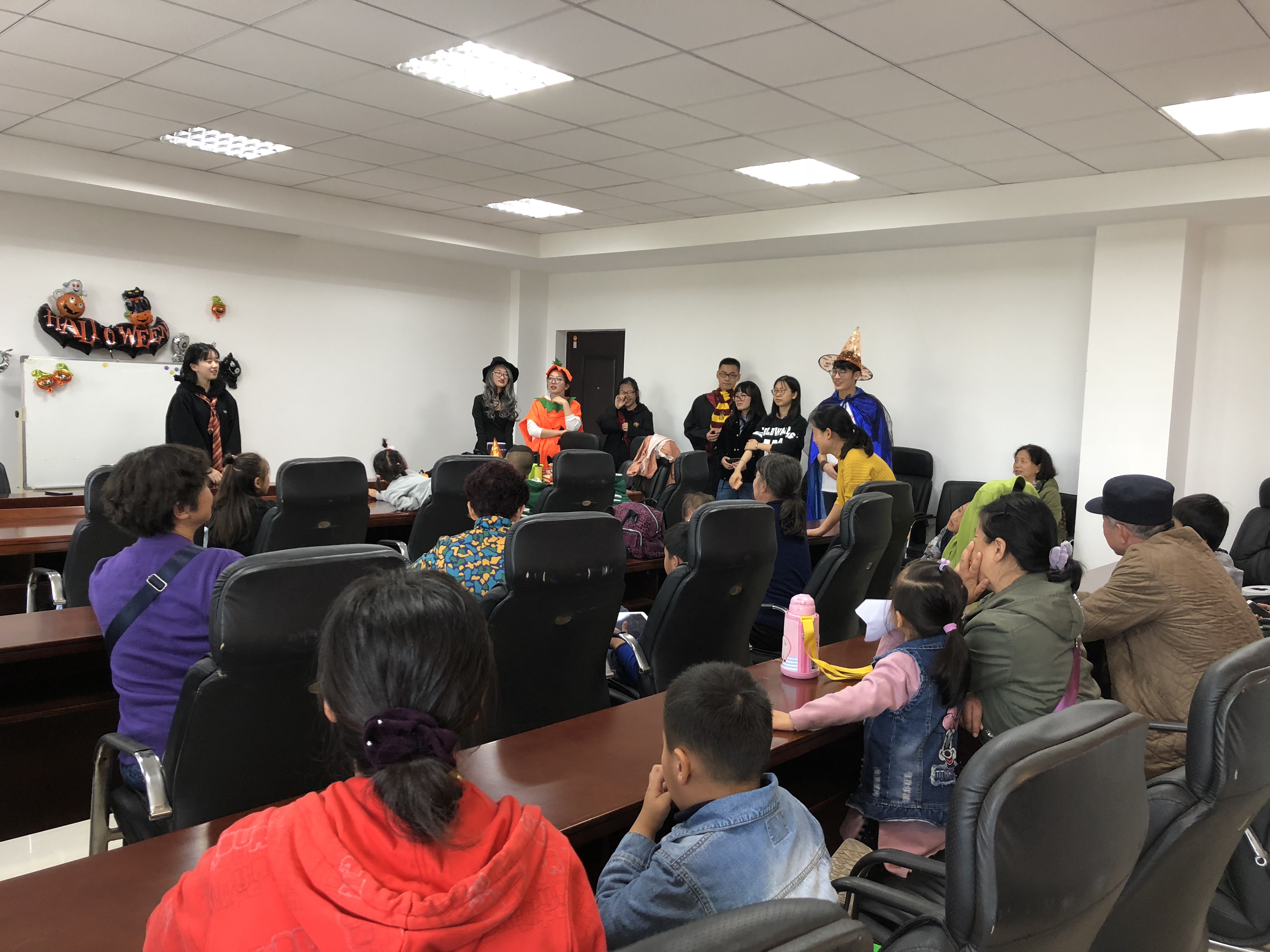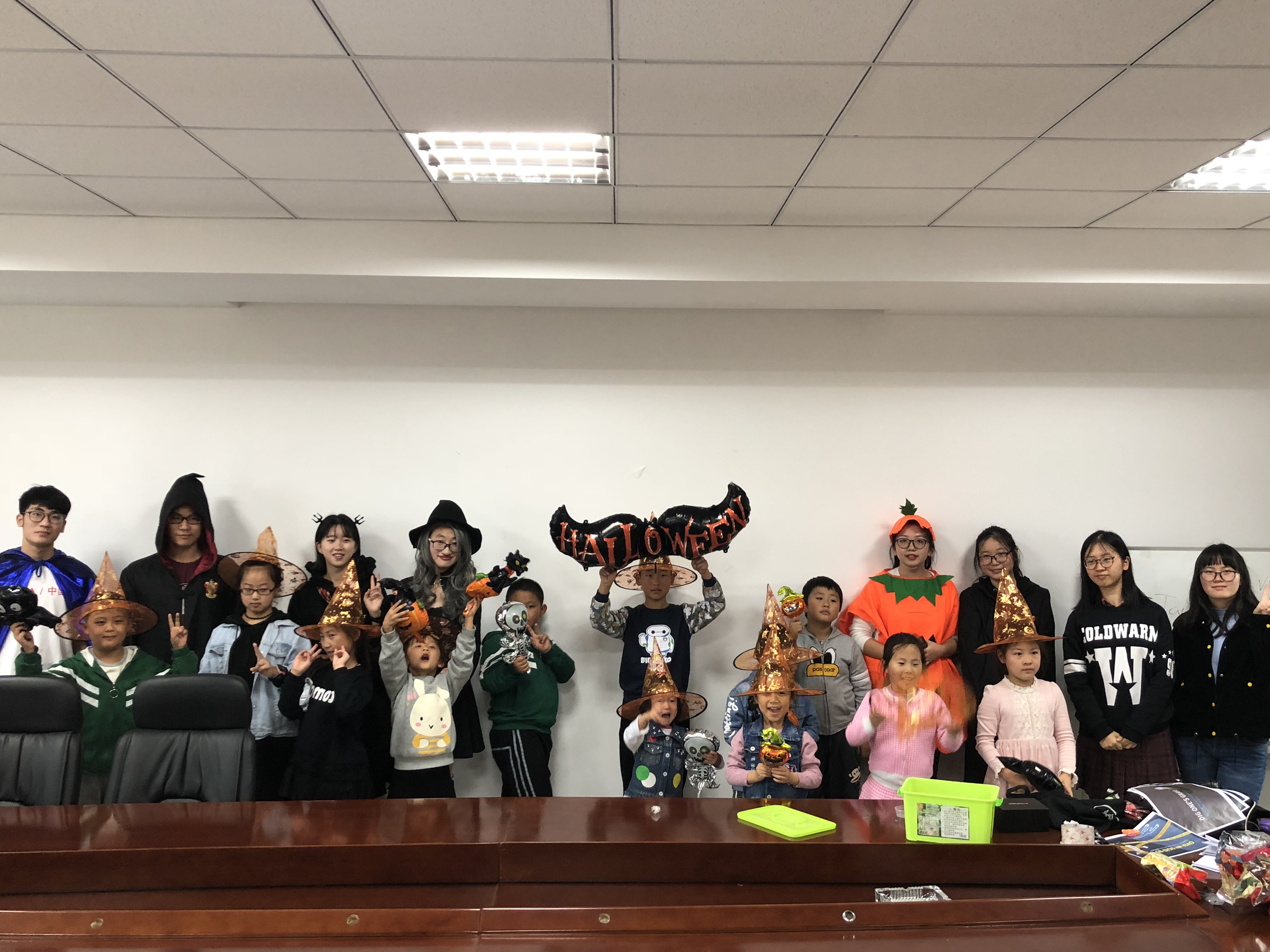 下午13点,志愿者们顺利抵达尧辰景园尧胜社区服务中心,进行场地布置、万圣节变装、物资清点等活动前期的准备工作。志愿者在活动正式开始前播放有关万圣节的歌曲,活跃了气氛。17级翻译班副团徐海娜主持活动,首先,她向小朋友与家长们介绍了大概的活动流程。而后,她用图片介绍了英国及其国旗、国徽并播放英国国歌,积极地与小孩子们进行互动。她还介绍了万圣节的由来,并教小朋友们相应的简单英文单词。下一个环节中,穿着南瓜灯玩偶装的陈思佳同学教孩子们与万圣节相关的英语单词,例如:鬼ghost、万圣节Halloween……小朋友们从南瓜盒中抽取英文卡片,根据单词指对志愿者手中图片的小朋友赠送糖果和万圣节饼干。接着,扮成女巫的龚张喆同学现场教小朋友一些万圣节的简单俚语,带领他们跟读,解释含义,并由王若晴、姜豹等志愿者给举手答对的小朋友赠送糖果。