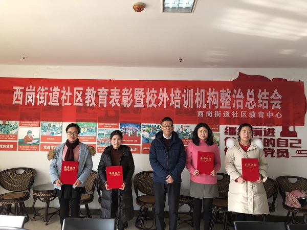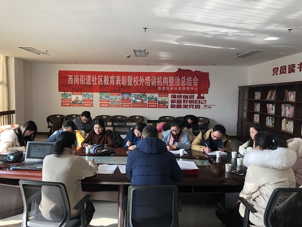 1月18日上午,西岗街道社区教育中心组织召开了2018年度社区教育总结表彰暨校外培训机构整治总结会,街道分管领导卞小兵参加了会议。街道劳保所和文化艺术中心、各社区居民学校的相关人员参加了会议。首先,由教育中心的罗琴校长总结了2018年西岗街道社区教育工作,对2019年社区教育工作理清了思路,和相关部门、社区人员进行了讨论,接着对全街道校外培训机构整治工作进行了总结,然后对2018年申报成功的一社一特进行了表彰。最后,卞主任对我们社区教育提出了更高的要求,一定要从居民的需要出发,提高幸福感、满意度,对校外培训机构整治工作要实行长效管理,社区各成员之间、部门之间一定协调合作,针对群众反映的突出问题,及时解决,化解矛盾,耐心指导,建立健康的教育环境,真正将校外培训整治工作落到实处,使中小学生健康快乐成长。