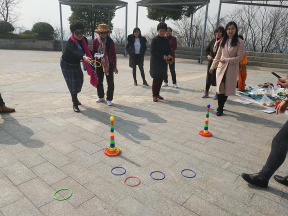 休息了一会,补充了能量以后,社区教育中心的工作人员给大家准备了套圈的小游戏活跃气氛。阿姨们卯足了劲想多套几个圈,大家你追我赶,好不热闹。游戏结束以后,按套中圈数量的多少给大家发放了奖品,阿姨们非常开心。