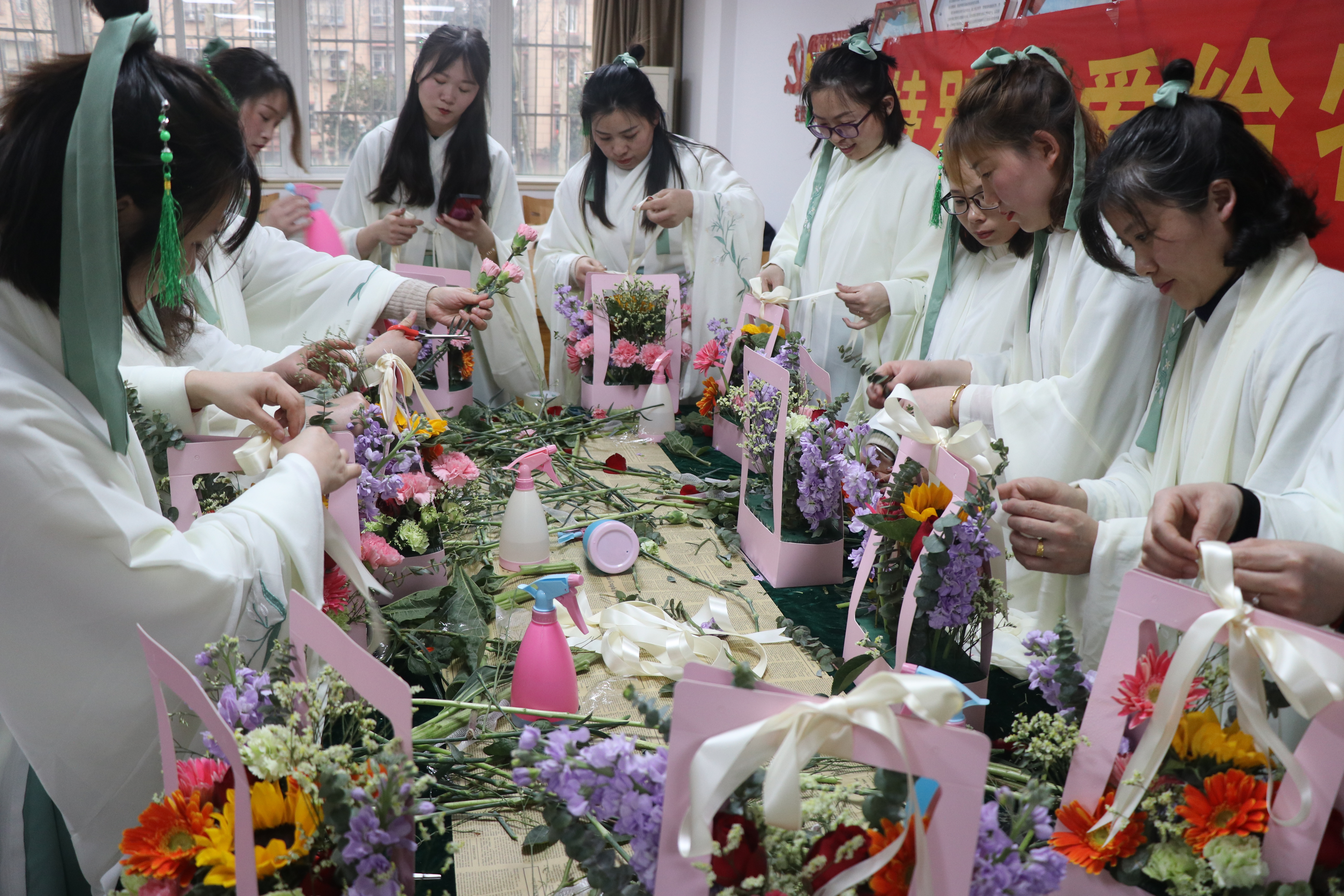 在第109个“三八”国际妇女节即将到来之际,3月4日上午九点,青田雅居社区党总支联合社区妇联、中建八局三公司基础设施分公司在社区二楼活动室开展了“特别的爱给特别的自己”为主题的喜迎三八活动,14名女职工参与其中。大家聚在一起,穿汉服、知礼仪、学插花,让美在身旁萦绕,让花香在指尖飘香,增添了浓浓的节日氛围。