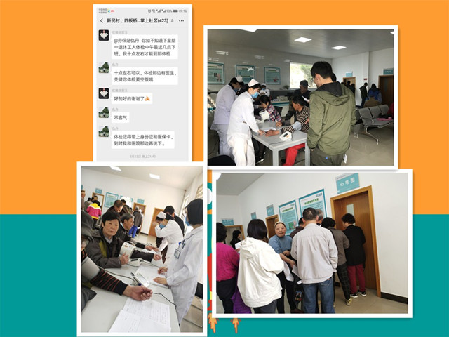 针对我村已大范围拆迁,退休人员居住地分散这种情况,社区便民服务中心劳保工作人员通过微信掌上社区进行宣传,并分期分批逐一电话通知退休人员体检时间、地点以及注意事项等。对高龄、行动不便等退休人员,劳保工作人员亲自上门,交代子女亲属陪同做好体检工作。为了防止老年人忘记时间,还会在体检前一天再次电话告知退休人员体检时间,若有特殊情况体检时间发生变动的也会及时重新预约体检时间,确保体检工作落实到位。
