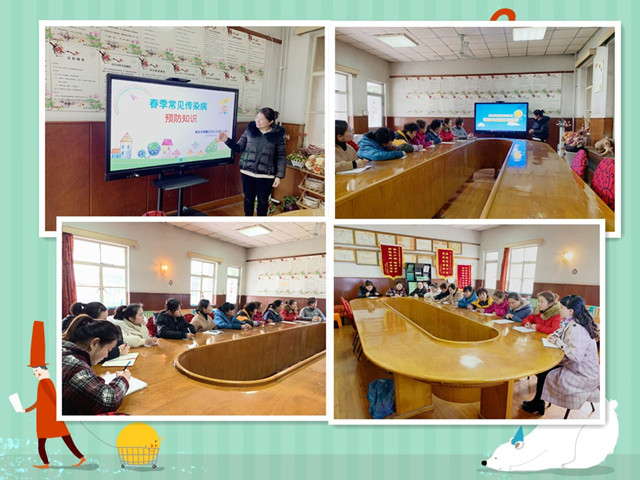 首先,幼儿园安全主任吴老师对教职工进行了预防传染病专题培训,详细介绍了一些春季传染病的发病特点、主要症状、传染源、传播方式和各种预防措施,如:手足口病、流感、水痘、诺如病毒等,提高教职工鉴别和防控传染病的能力。同时,杨园长强调:预防传染病是每个人的责任,要求教职工要保障各项传染病防控措施落实到位。