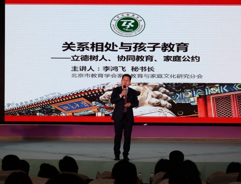 活动第二个环节由北京市教育学会家长教育与家庭文化研究分会李鸿飞秘书长带来专题讲座——《关系相处与孩子教育——立德树人、协同教育、家庭公约》。李秘书长从家庭教育的国家政策、家庭教育的目标、达到目标的路径以及在北京家庭教育的实践经验等四个方面和大家做了分享。在座的各位老师和家长都表示受益匪浅。