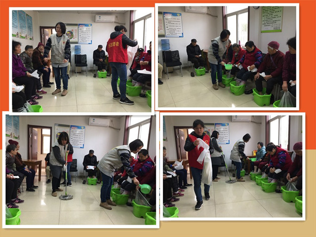活动开始后,社区工作人员又将中药熬成的温水分到每一个足浴桶内,并根据老人们的冷热需求,添加冷水。同时,还不停地拿着拖把将地上的水渍拖干净防止地滑,避免安全隐患。