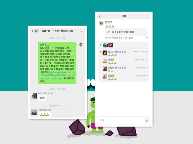 “掌上云社区”里的党员、群众纷纷参加了此次活动,尤其是一些退伍老兵,更是积极转发。他们说:“革命烈士,永垂不朽!”“革命精神,永存于世!”“如今的好生活是先烈们抛头颅、洒热血换来的!”他们建议社区经常性开展爱国主义教育,实地缅怀革命先烈。