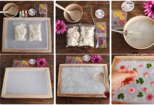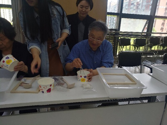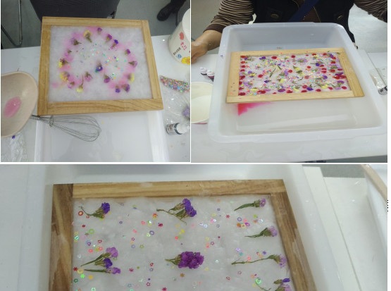 首先,将主办方为大家提供的“浓缩纸浆”加水倒入自备的空瓶里,上下使劲摇晃使之稀释均匀,然后倒入盆中,待搅拌均匀后,将主办方提供的画框缓缓的在水中不断上下提起摇晃,使纸浆可以均匀地分布在画框上。之后,居民们便可以用自带的花草树叶在画框上摆出自己喜欢的图案了,完成之后,再在上面轻轻地倒上一层薄薄的纸浆,经过晾晒之后即可成为真正的“花草纸”了。