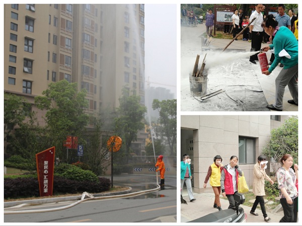 此次消防演习共分两部分。第一部分,掌握消防知识。物业管理处工作人员为居民讲解火灾的预防、逃生自救技能和灭火器等消防器材使用的消防知识,指出居民在演练过程中应该注意的事项,使居民更进一步了解消防知识。第二部分,开展消防演习。首先,消防人员在4幢处放下烟雾弹,居民在听到警鸣声后意识到发生火灾,随后,他们在社区工作人员和党员志愿者的引导下,手捂湿毛巾,井然有序的、迅速的撤离到安全的避难场所。接下来,幼儿园小朋友按照计划路线进行撤离,途中,孩子们听从指挥,不惊慌、不拥挤,在沿途社区志愿者的护送下,最终安全到达临时应急避难场所。