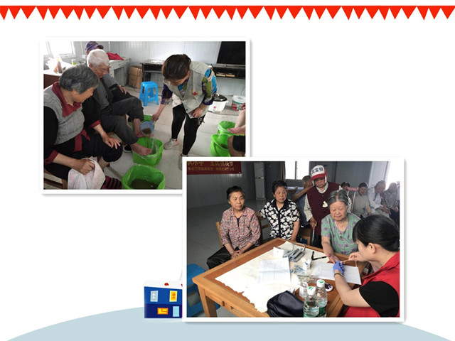 活动当天,志愿者们早早就来到现场进行秩序引导服务。悦园养老院的医护人员为老人测量血压、血糖,脉搏、中医搭脉、中医泡脚等项目服务,并向老年人发放健康保健宣传册,用通俗的语言告知老人健康生活常识及高盐饮食等不良生活习惯的危害,有针对性地给老人一些防暑降温、保养锻炼的建议。对于长期服用高血压、呼吸道等疾病用药的老人,医护人员详细询问他们的用药情况、平日的生活方式,对一些用药情况提出科学地调整意见。志愿者们在服务的过程中还对测量过程中出现健康问题的居民进行了记录,以利于后续健康服务的跟进。70多岁残疾老人华秀珍说“我腿脚不方便,平时很少去做常规保健检查,这次活动让我们这些老人享受到家门口实实在在的服务。”