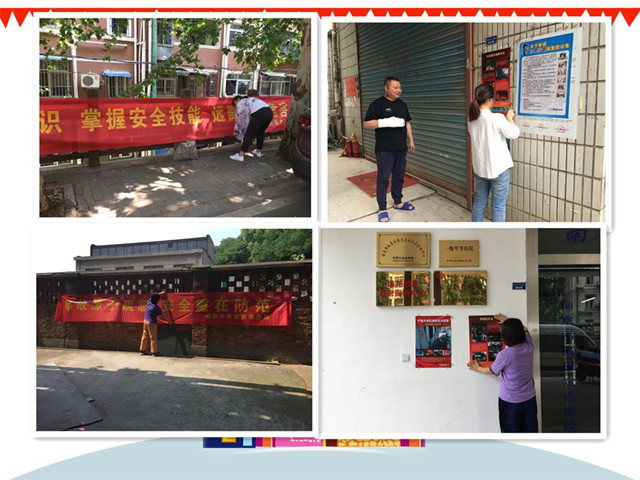 在宣传活动中,社区工作人员一方面在不同区域粘贴宣传画:在公告栏里张贴“有效防范化解重大消防安全风险,坚决消除9类突出问题”,在大众浴室、瑞龙老人护理院、小李饭店、宝慧家常菜等场所张贴“公共娱乐场所、养老院、宾馆饭店火灾实例,严防以上单位消防安全隐患”;另一方面在企业门前悬挂横幅,包括“学习安全知识,掌握安全技能,远离事故危害”、“事故缘于疏忽、安全重在防范”等。