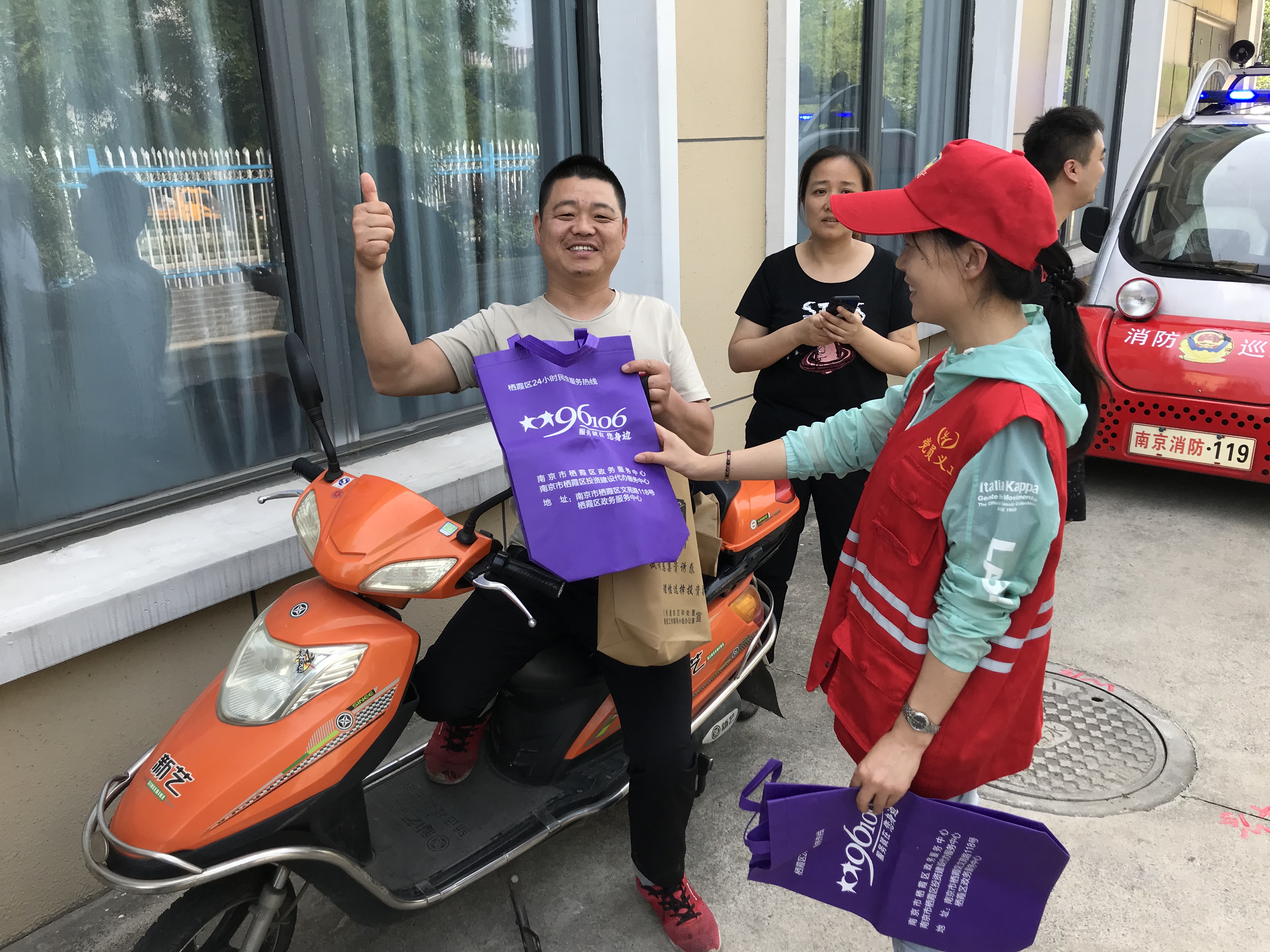 讲座结束后,所有人来到了室外,栖霞消防中队的队员向大家介绍了消防器材的使用方法和技能,然后进行了消防实战演练,现场准备了三个灭火桶及20具灭火器,商户们在消防队员的指导下,一一完成了灭火训练。与此同时,社区全科社工积极推动集成改革创新,利用活动契机开展栖霞区“96106民生热线”宣传工作,详细地为大家解答了“96106民生热线”的服务概况、服务方式、工作范围、办理时限等基本情况,同时,还向大家发放了宣传彩页、环保袋等宣传用品。