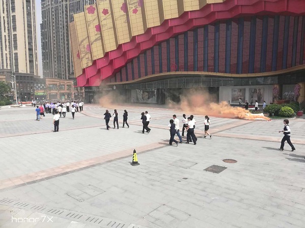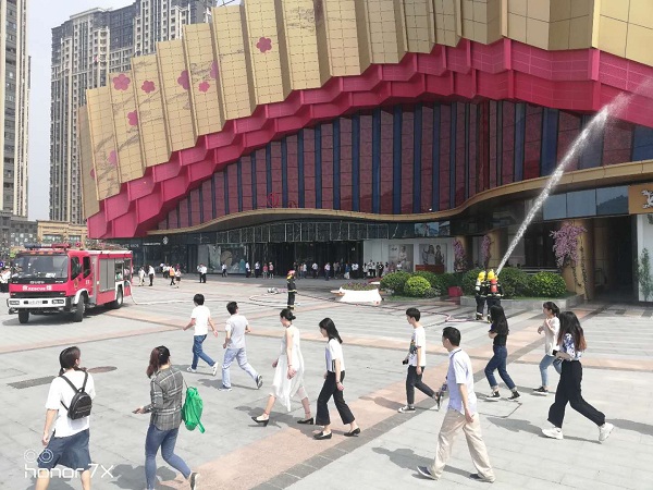 上午9:30,各参演单位就绪,万达茂现场总指挥王总经理宣布演练开始。万达茂发起火警警报,现场立即联系消防中队报告火情,请求灭火支援。万达茂商管及物业管理人员立即展开人员疏散工作,并拉起警戒线,边拉起警戒线,疏散周围人群,禁止火种靠近事故区域,及时转诊伤员,消防中队到场后,对现场进行灭火处理。商管消防工程师讲解日常消防安全常识、如何扑救初期火灾及消防水带、灭火器的使用方法等知识,并现场演示如何用灭火器进行灭火。