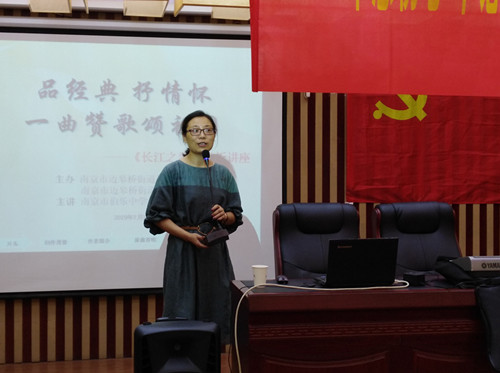 主讲人王蔚老师以“话说长江”为切入点,带领大家领略了长江的丰厚底蕴,欣赏了不同版本的经典歌曲《长江之歌》,并探究了在不同的唱法下、不同的演奏技艺下、不同的时代背景下,这首歌所蕴含的人文情怀与时代特征,从而引发了与在场观众的强烈共鸣,爱家乡爱祖国之情油然而生,全体党员陶醉在长江母亲河的怀抱之中,最后在全场观众的激情合唱中,将此次活动推向高潮。
