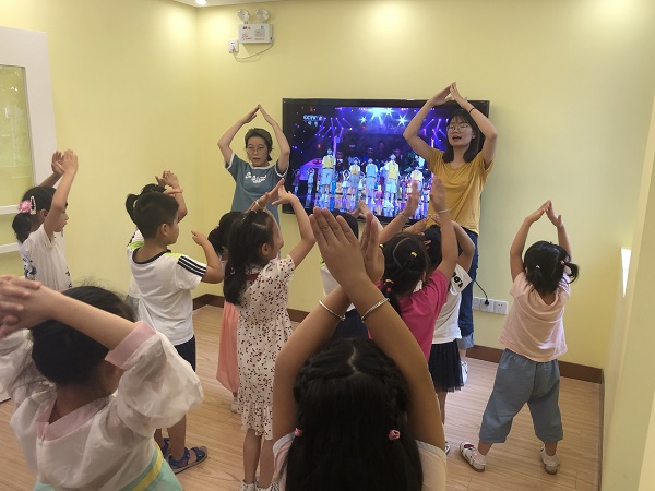 下午,讲师们教孩子们关于家国的简单的手语操。很多小朋友在课前看到手语操的视频,自己就先学起来了。“家是一小国,国是千万家”,伴随着音乐一遍遍的播放,小朋友们的动作也越来越熟练。短短一个多小时,所有的小朋友都展示了自己的学习成果——上台表演,台下也是掌声不断。