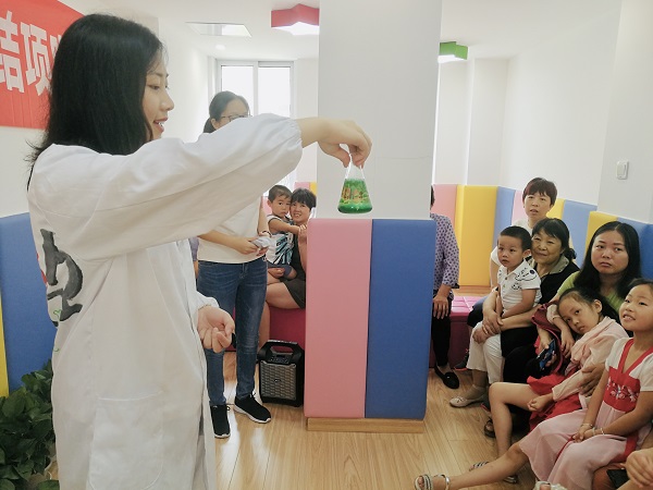 外展活动结束后,便是正式开始室内活动了。南京师范大学化学与材料科学学院团委副书记暨“SCCS”暑期社会实践团队指导老师马艳戎老师致辞表达了对大家的期待,促使我们将不忘初心,砥砺前行,继续将科学的种子洒满小朋友们的心间。童声歌唱,无声手语,一一展现在家长、孩子们的面前,为他们带来了一场视觉盛宴。击鼓传花,声停花落者,上台表演;实验走秀,色彩多变,引发阵阵惊呼。顿时,欢声、笑声、起哄声,不一而足。汇演结束后,闻兰社区便民服务站的工作人员及“SCCS”讲师们为孩子们颁发奖品,鼓励他们不断充实自我,追寻科学脚步。