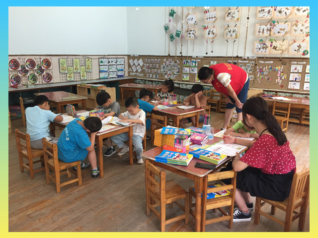 活动开始后,社区志愿者指导幼儿一步步的描绘拼音和简单笔画,通过绘画样式的书写练习,向幼儿渗透有关笔画、笔顺的知识,帮助他们建立上下左右等空间知觉,掌握基础的书写技能。