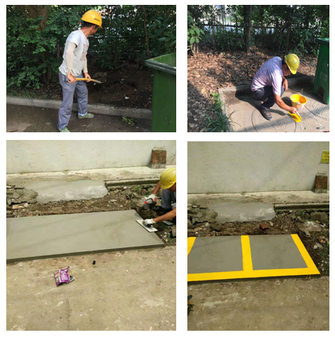 社区把所有垃圾桶进行了清洗,对破旧的垃圾桶进行了更换。更主要的是,社区统一把所有摆放垃圾桶的位置进行了改造。原来坑坑洼洼的地面用水泥抹平,用醒目的黄色漆在地面做出标示线。经过改造后,既变得更美观了,同时也便于垃圾桶位置固定摆放,也是提醒居民垃圾入桶。